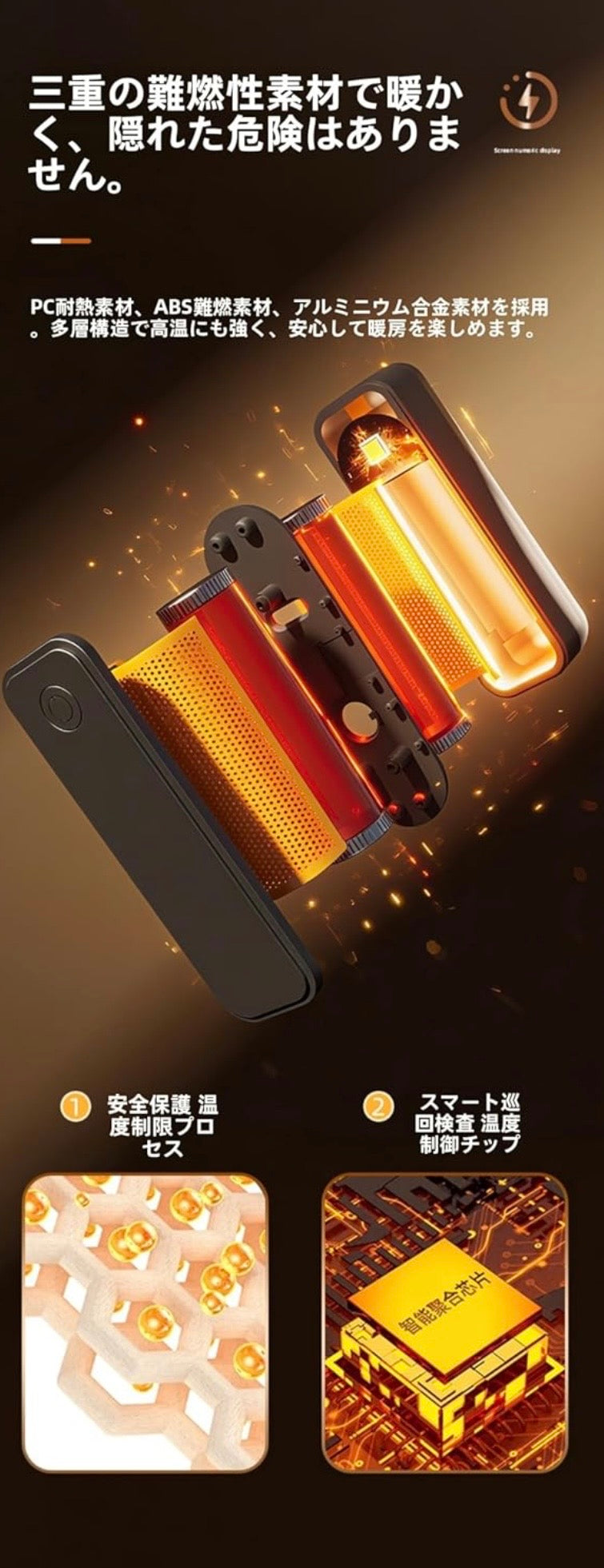 - 安心の全面防爆構造:内部に精密な温度保護装置を搭載し、高温になりすぎる心配がありません。柔軟で丈夫な特殊素材を採用し、落下時の衝撃にも強く、長時間使用しても変形しにくい耐久性。日本の安全基準に準拄した信頼設計で、職場でもリビングでも、ゆったりと温もりをお届けします。