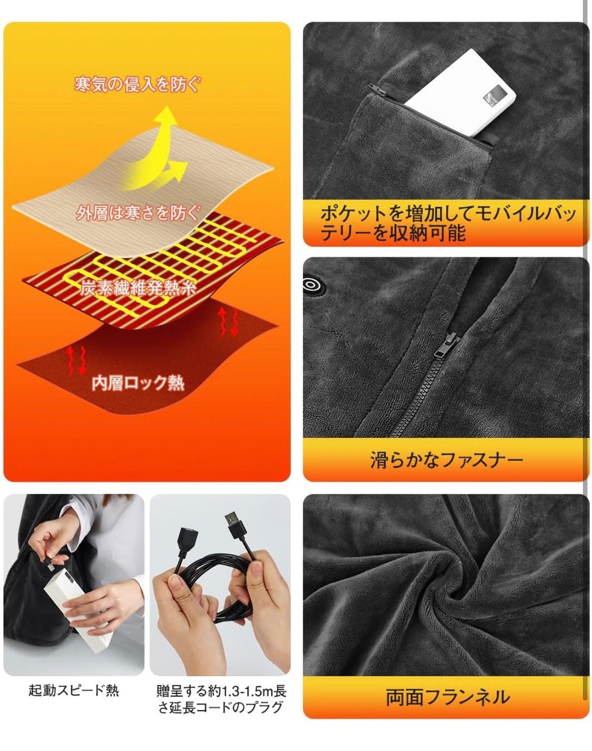 - ■付属品:ブランケット本体、延長USB充電ケーブル 1m ※バッテリーは付属しておりません。別途ご用意ください。