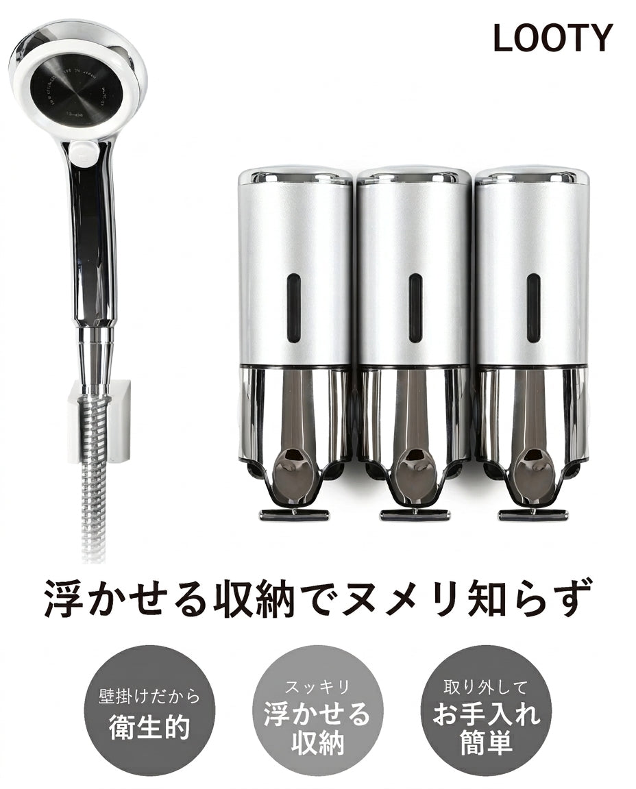 ボトルを置くだけで、お風呂がホテルに変わる!🛁まるで高級ホテルのバスルームのような壁付けデザイン🏨どこでもピタッと固定🧲底ヌメリ・水アカとサヨナラ、掃除の手間を大幅カット🧹大容量500ml×最大3本で詰め替え頻度もグッと減る💡片手でサッと出せるレバー式!工事不要、届いたらすぐ使える✨