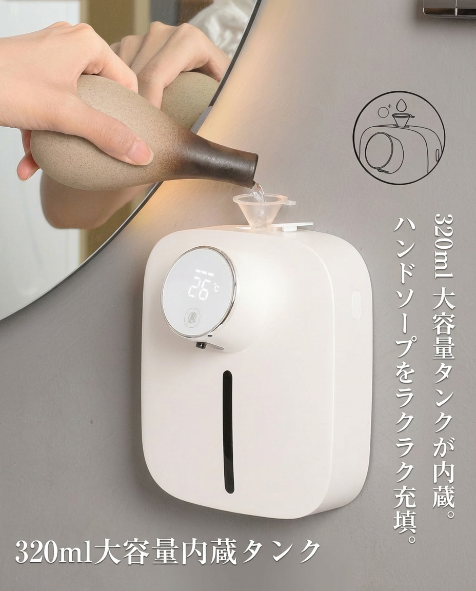 触れずに泡が出る、次世代のハンドケア体験!🫧高精度赤外線センサーでわずか0.25秒で泡が出る🖐️3段階の泡量調整(1s / 1.5s / 2s)で大人も子どもも最適な量に🌀USB充電式で1回のフル充電で約4ヶ月使える🔋壁掛け&置き型の2WAY設計でどこでも使える✨温度・湿度表示のLEDディスプレイ付きでスマートなバスルームに!